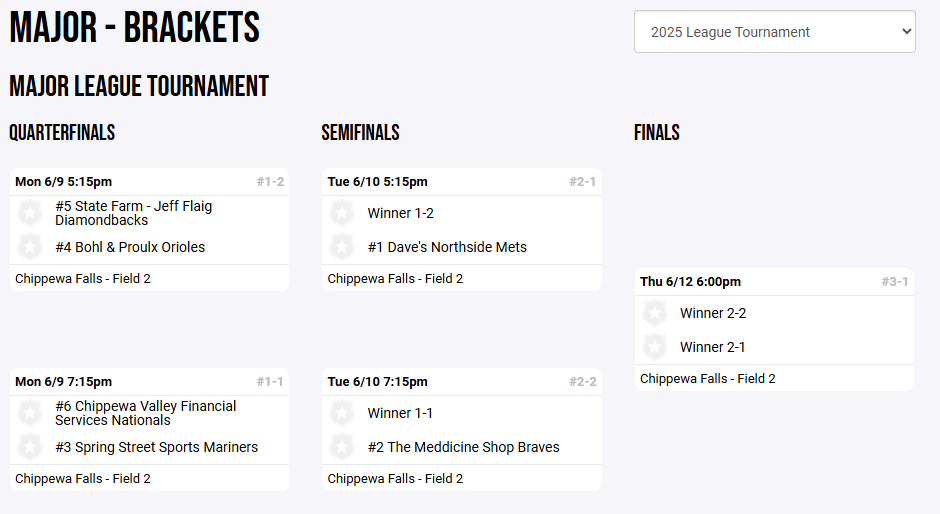 The end of the regular season means the league tournament starts next week. Above is the tournament bracket. As the tournament progresses the bracket will be updated on the website. To follow the tournament click on the "Division" tab at the top of the screen. Then click on the division that you are looking to follow (Pony, Major, Minor), and then on the left side click on "Brackets". In the top right corner, there is also a toggle between the regular season and league tournament to follow along with tournament play.